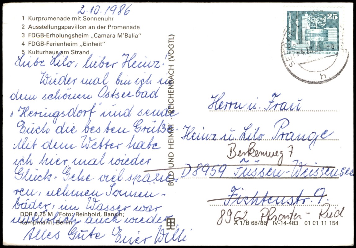 Ansichtskarte: Kurpromenade mit Sonnenuhr, Ausstellungspavillon an der Promenade, FDGB-Erholungsheim Camara M'Balia - Einheit, Kulturhaus am Strand - Heringsdorf Usedom