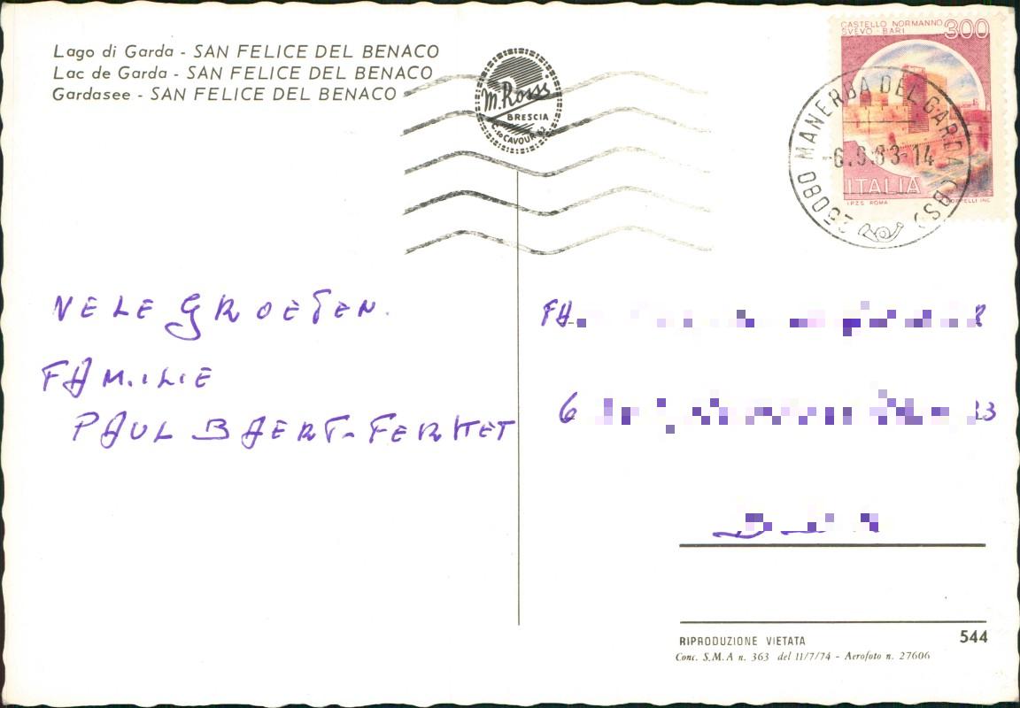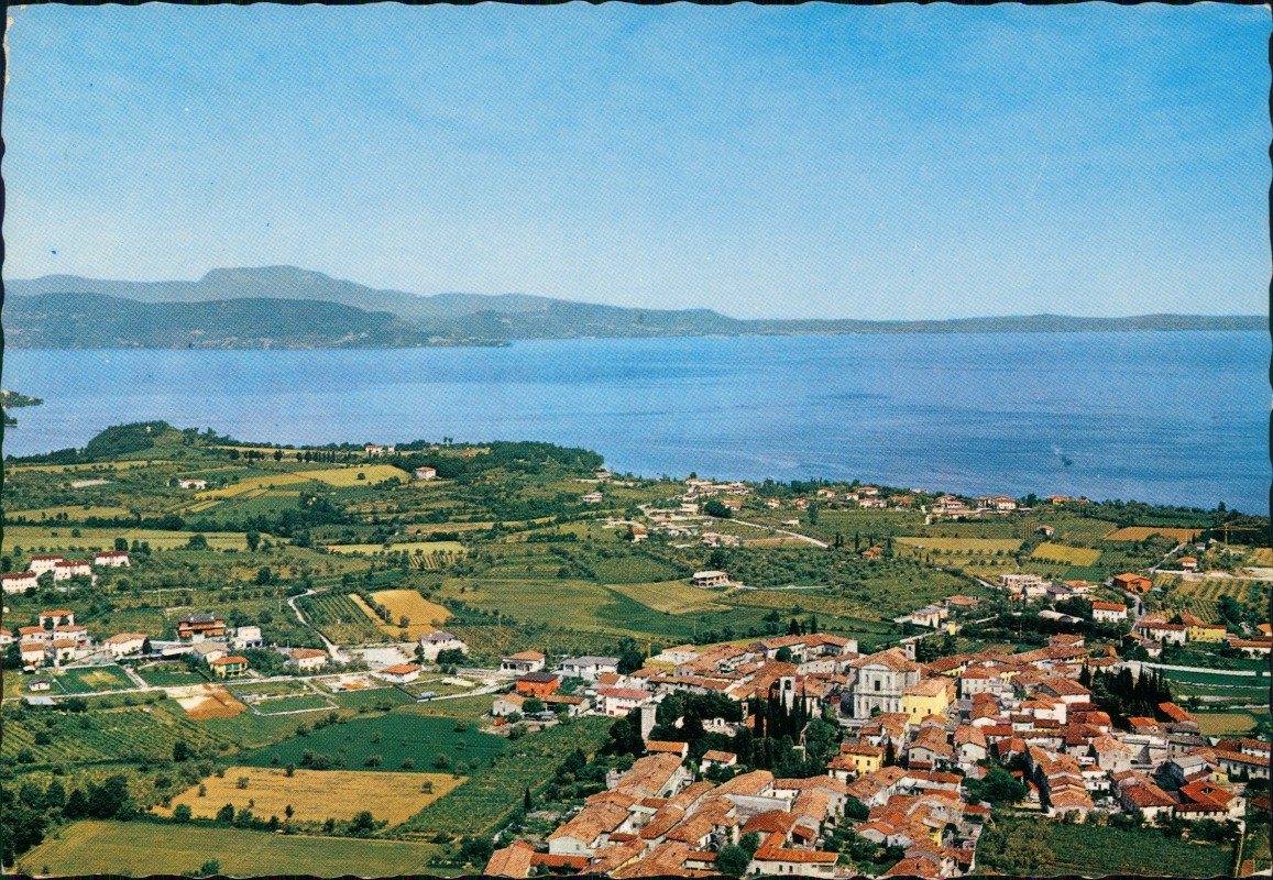 - Farbige Luftaufnahme (Aerofoto) von San Felice del Benaco am Westufer des Gardasees. Die Ansicht zeigt den Ortskern mit der Kirche, die umliegende Kulturlandschaft mit Feldern und Olivenhainen sowie den Blick auf den See. Herausgegeben von M. Rossi, Brescia. Rückseitig finden sich Angaben zur Aerofoto-Nummer 27606 und eine Konzessionsnummer der S.M.A. von 1974.