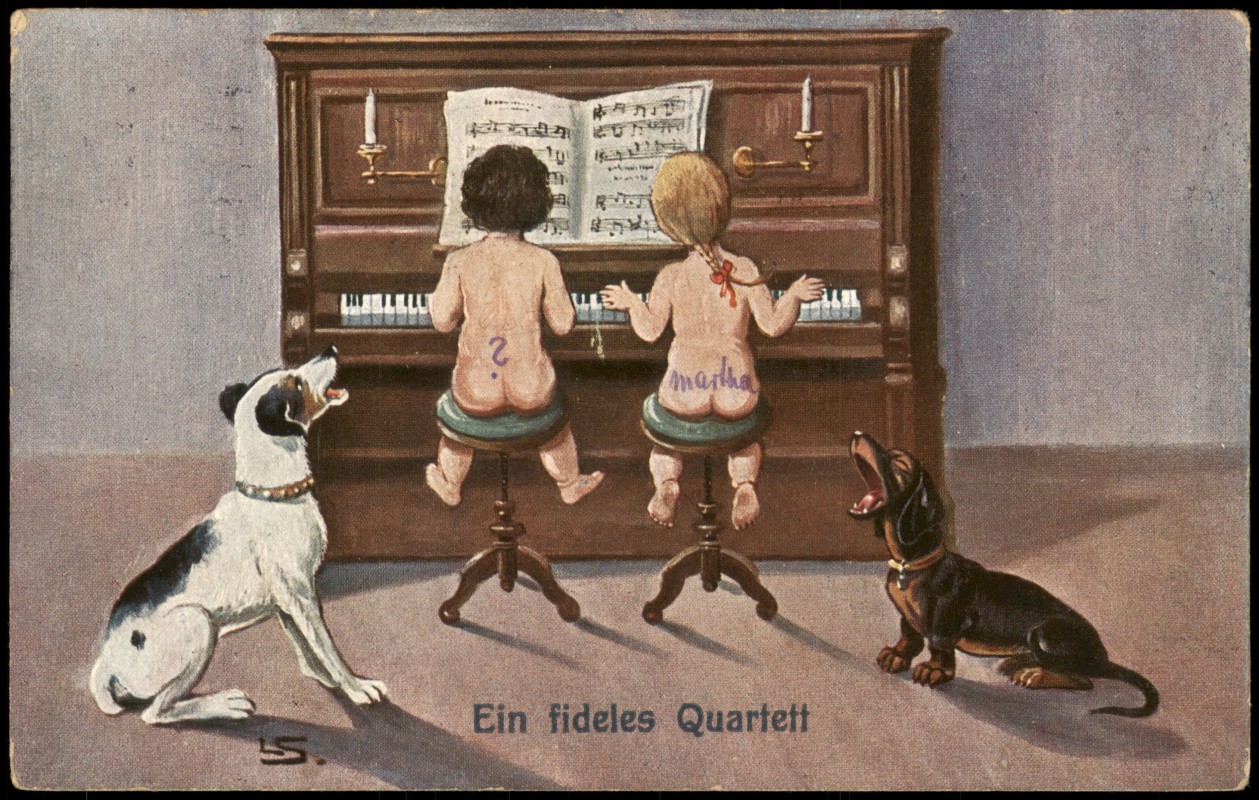 - Kinder Künstlerkarte Junge und Mädchen vor Klavier Hunde