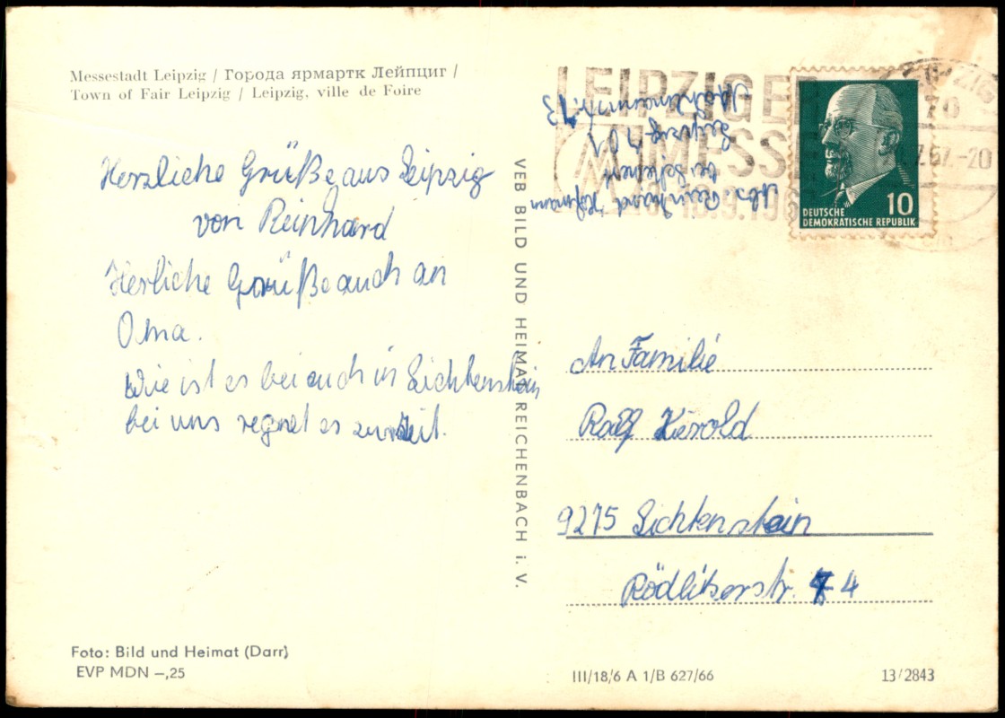- Mehrbild-Postkarte der Messestadt Leipzig mit vier Ansichten. Zu sehen sind der Eingang zu Auerbachs Keller in der Mädler-Passage, zwei Innenansichten der Passage sowie das Messehaus am Markt mit regem Publikumsverkehr. Die Fotografien stammen von Darr.