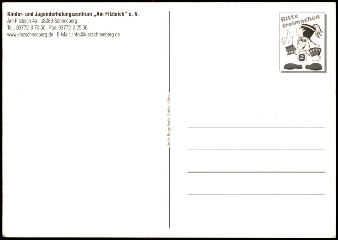 - Mehrbild-Postkarte des Kinder- und Jugenderholungszentrums (KiEZ) 'Am Filzteich' in Schneeberg, Erzgebirge. Die Karte zeigt eine großflächige Ansicht der Anlage sowie fünf kleinere Detailaufnahmen verschiedener Freizeitaktivitäten: Volleyball, Klettern im Seilgarten, Reiten, Billard und eine Gruppenanimation. Rechts ist ein farbenfrohes Maskottchen abgebildet. Die Karte wirbt mit dem Slogan 'Das Fit- und Fun-Highlight im Erzgebirge'.