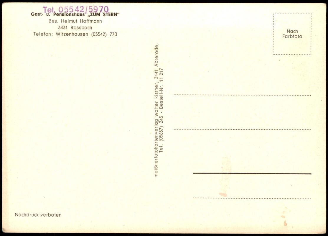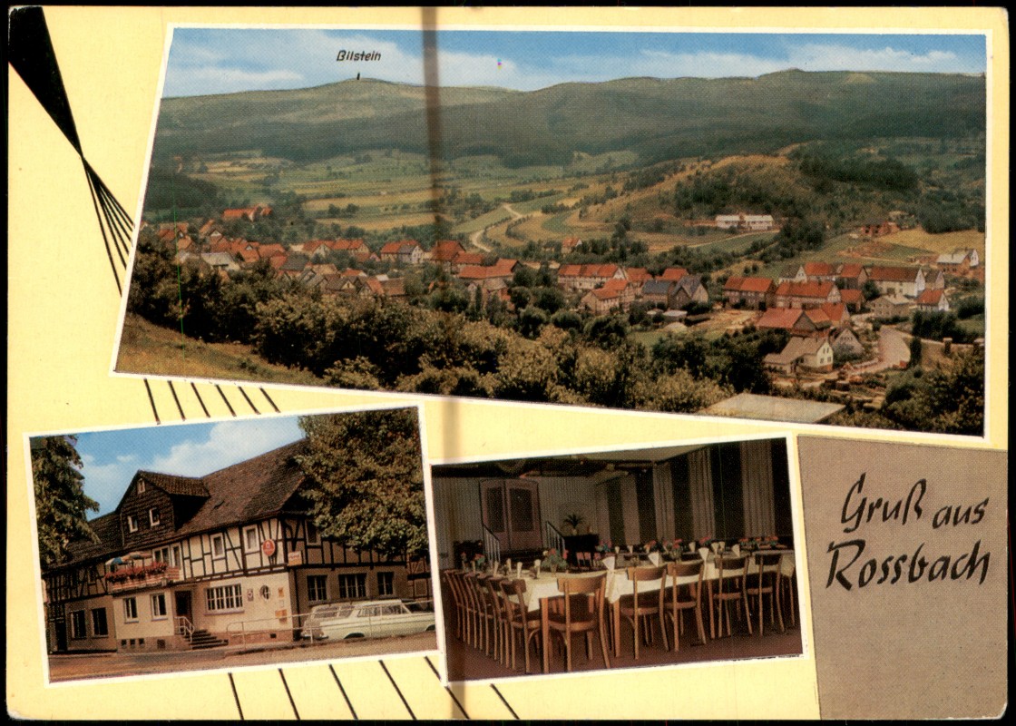 - Mehrbildkarte von Rossbach bei Witzenhausen. Die Karte zeigt oben eine Panorama-Ortsansicht mit dem markierten Berg Bilstein im Hintergrund. Unten links ist das Gast- und Pensionshaus 'Zum Stern' (Besitzer Helmut Hoffmann) in einem traditionellen Fachwerkgebäude abgebildet, daneben eine Innenansicht des Speiseraums. Die Karte wurde nach einem Farbfoto erstellt.
