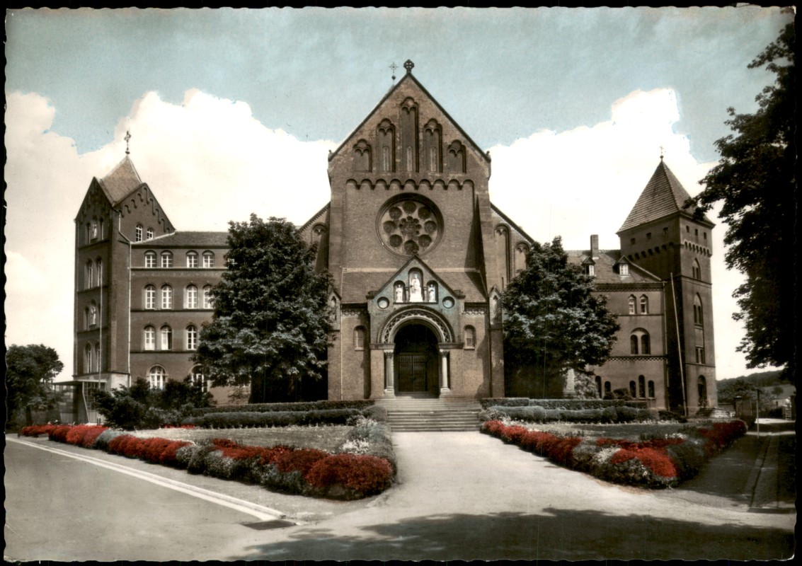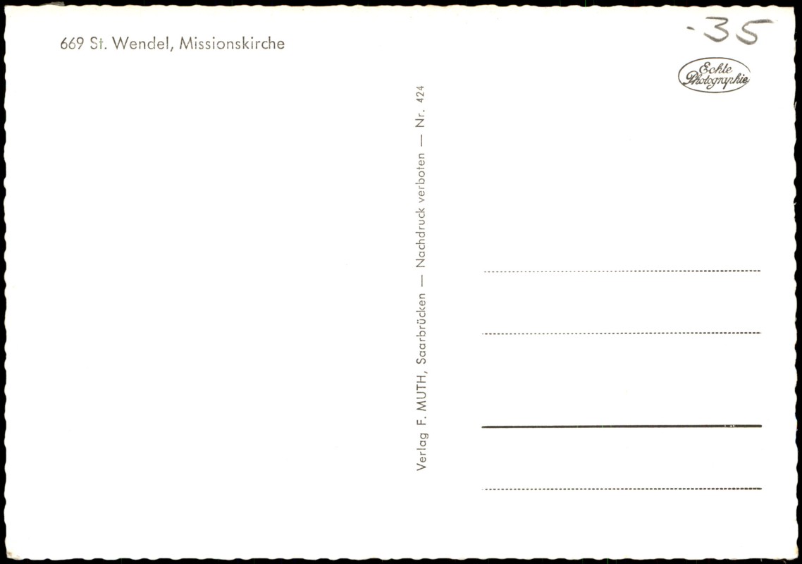 - Echtfoto-Postkarte der Missionskirche (Missionshaus St. Wendel) in St. Wendel. Die Aufnahme zeigt die beeindruckende Fassade des Kirchenbaus mit dem Rundbogenportal, der Fensterrose und den flankierenden Gebäudeflügeln. Im Vordergrund sind symmetrisch angelegte Blumenbeete und Grünanlagen zu sehen. Die Karte wurde von 'Echte Photographie' aufgenommen und im Verlag F. Muth veröffentlicht.