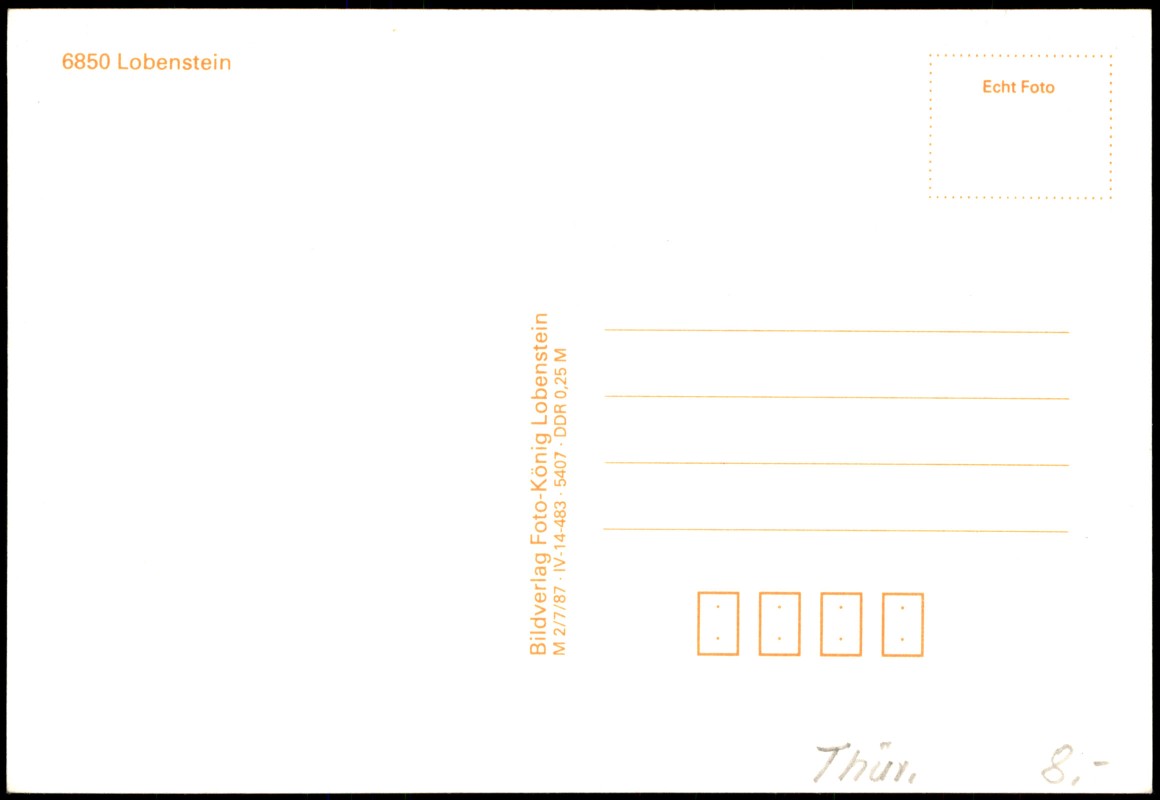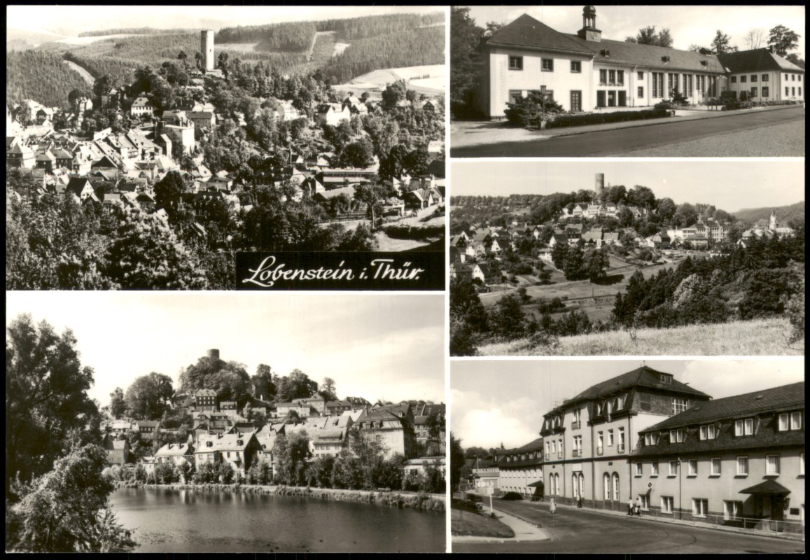 - Echtfoto-Mehrbildkarte mit fünf Ansichten von Lobenstein in Thüringen. Gezeigt werden verschiedene Stadtpanoramen mit dem markanten 'Alten Turm' sowie Ansichten von größeren Gebäudekomplexen, bei denen es sich vermutlich um Einrichtungen des Moorbades handelt. Die Karte stammt aus der DDR-Produktion von 1987.