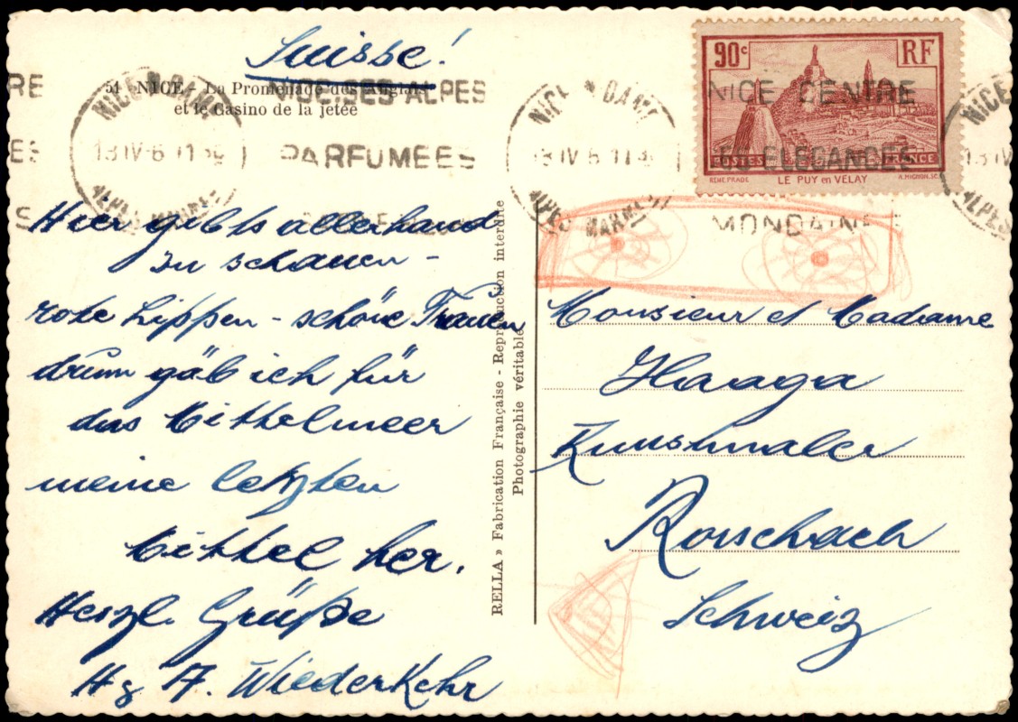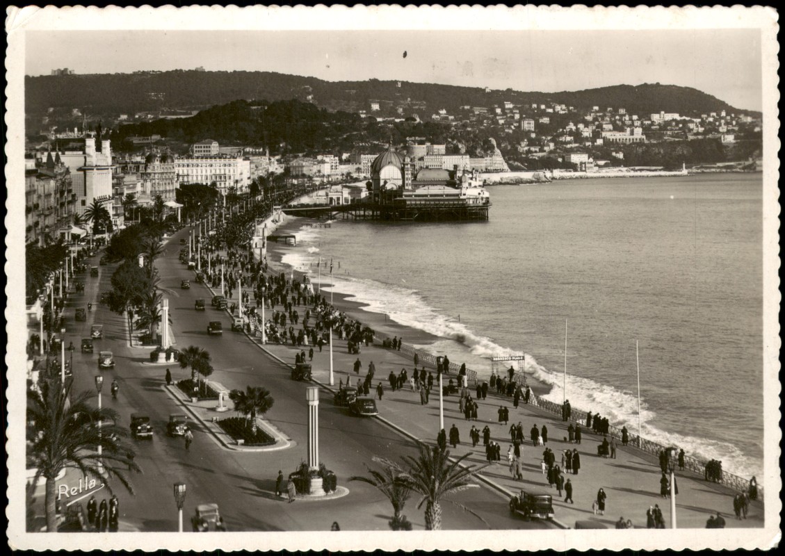 - Echte Fotografie (Photographie véritable) der Promenade des Anglais in Nizza. Die Ansicht zeigt die belebte Uferpromenade mit zeitgenössischen Automobilen und zahlreichen Spaziergängern. Im Mittelpunkt steht das auf einer Seebrücke errichtete Casino de la Jetée-Promenade. Rechts ist der Kiesstrand und das Mittelmeer zu sehen, im Hintergrund die städtische Bebauung am Hang.