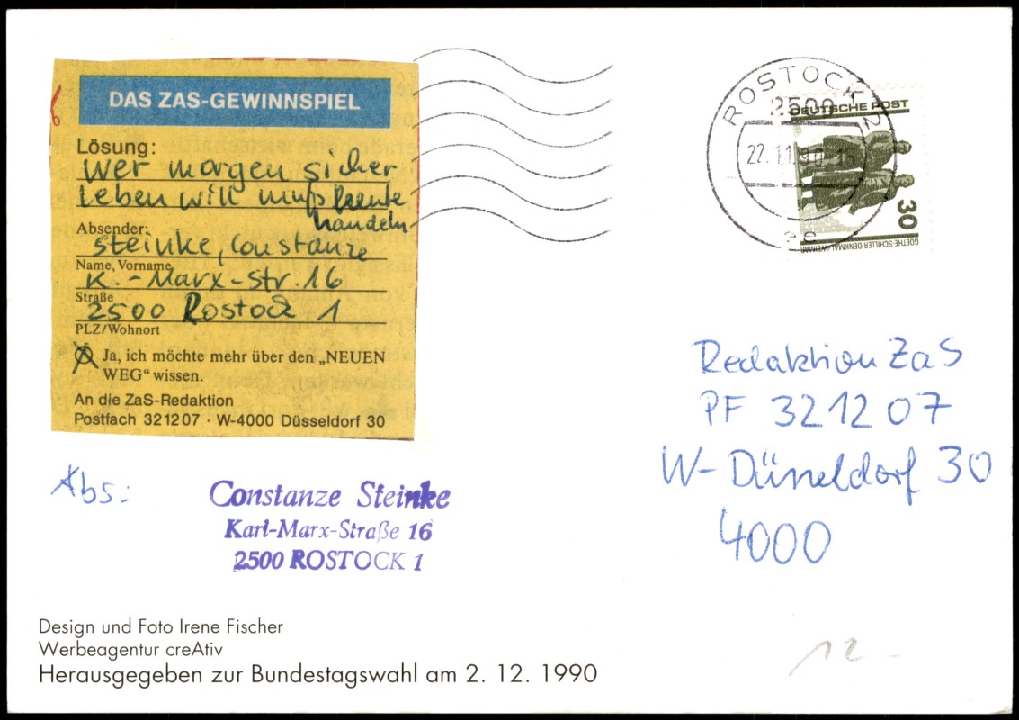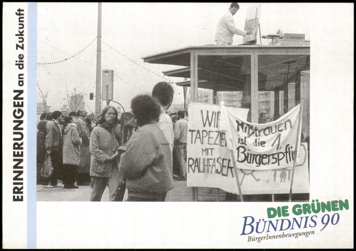 - Politische Postkarte zur ersten gesamtdeutschen Bundestagswahl am 2. Dezember 1990. Die Vorderseite zeigt eine Schwarz-Weiß-Fotografie einer Demonstration mit Transparenten und den Aufschriften 'Mißtrauen ist die Bürgerpflicht' sowie 'WIR TAPEZIEREN MIT RAUHFASER'. Enthalten sind die Logos von 'Die Grünen' und 'Bündnis 90 BürgerInnenbewegungen'. Rückseitig befindet sich ein Gewinnspiel der 'ZaS-Redaktion' (Zeitung am Sonntag). Design und Foto stammen von Irene Fischer, Werbeagentur creAtiv.