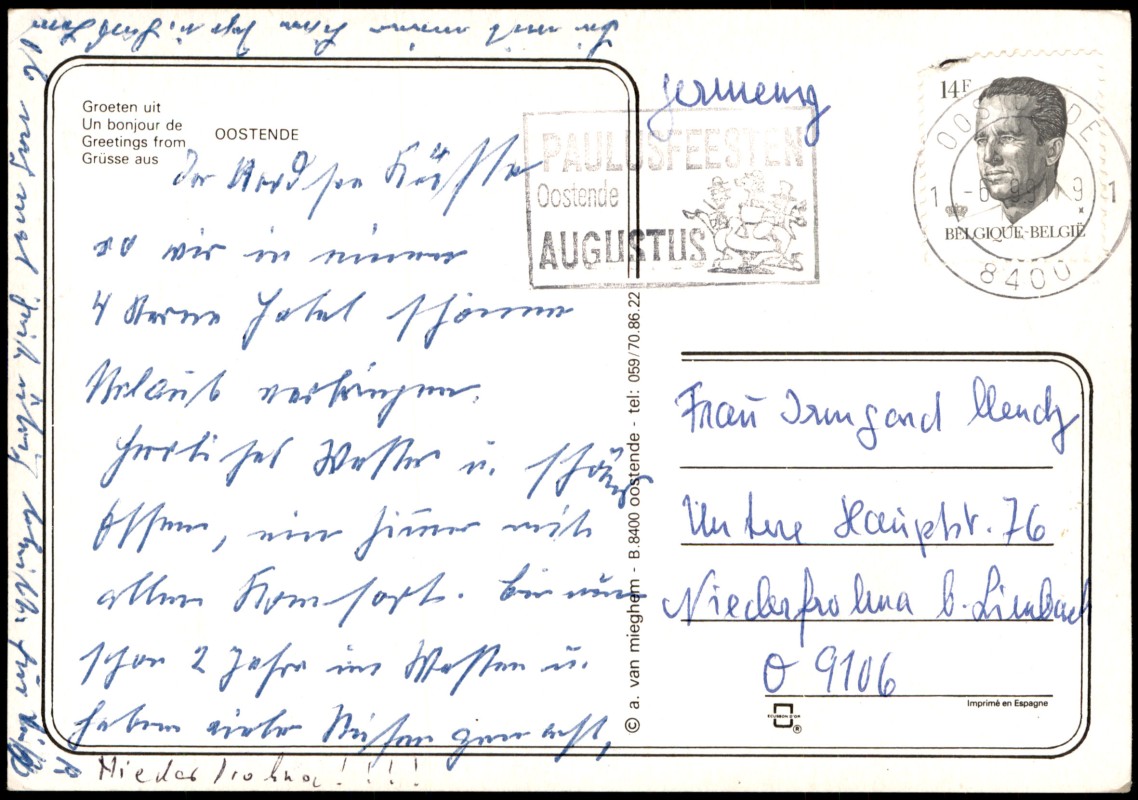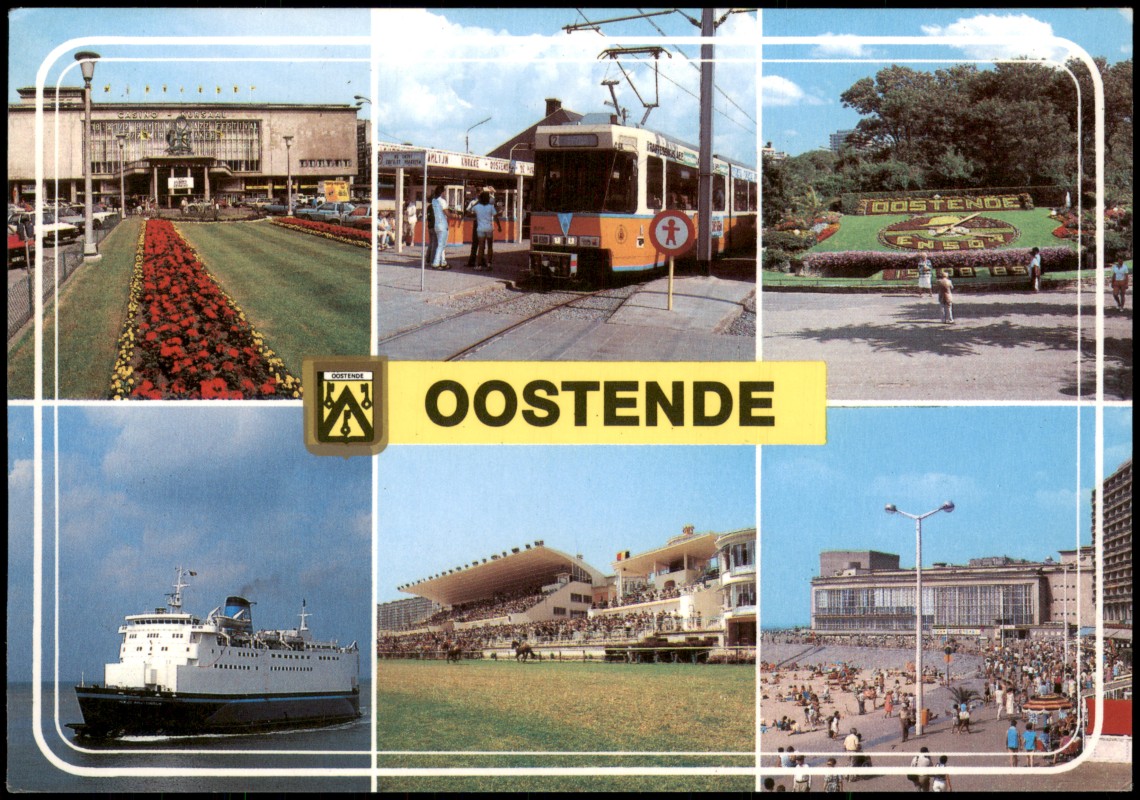 - Diese Postkarte zeigt eine Collage von vier verschiedenen Ansichten der belgischen Küstenstadt Oostende. Oben links ist das moderne Casino-Kursaal mit Blumenbeeten zu sehen. Oben rechts eine Straßenbahn und ein großes Blumenbeet, das den Stadtnamen 'OOSTENDE' bildet. Unten links fährt eine Fähre auf dem Wasser. Unten rechts sind die Pferderennbahn mit Zuschauern und ein belebter Strandbereich mit einem großen Gebäude im Hintergrund abgebildet. Die Karte wurde von a. van mieghem in Oostende vertrieben und in Spanien gedruckt.