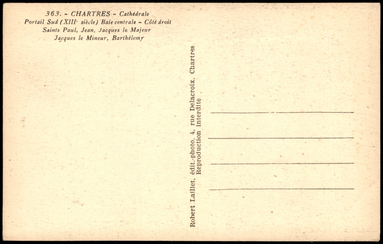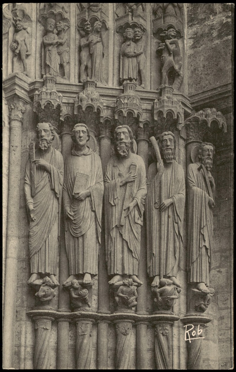 - Detailansicht des südlichen Portals (13. Jahrhundert) der Kathedrale von Chartres, zentrale Bucht, rechte Seite. Dargestellt sind die Heiligen Paul, Johannes, Jakobus der Ältere, Jakobus der Jüngere und Bartholomäus. Herausgegeben von Robert Laillet, édit.-photo, 4, rue Delacroix, Chartres. Reproduktion verboten. Seriennummer 363.