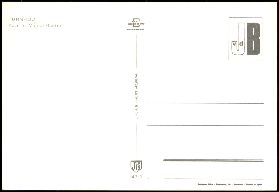 - Farbfotografische Ansichtskarte der Kazerne Majoor Blairon in Turnhout. Zu sehen ist ein weitläufiges, funktionales Backsteingebäude der Kaserne hinter einer Grünfläche. In der oberen rechten Ecke der Vorderseite ist das Stadtwappen von Turnhout eingefügt. Die Karte wurde von Ediciones FISA in Barcelona (Spanien) gedruckt und trägt das Logo 'Escudo de Oro'. Als lokaler Kontakt/Vertrieb ist 'J. V. d. B.' mit einer belgischen Telefonnummer angegeben.