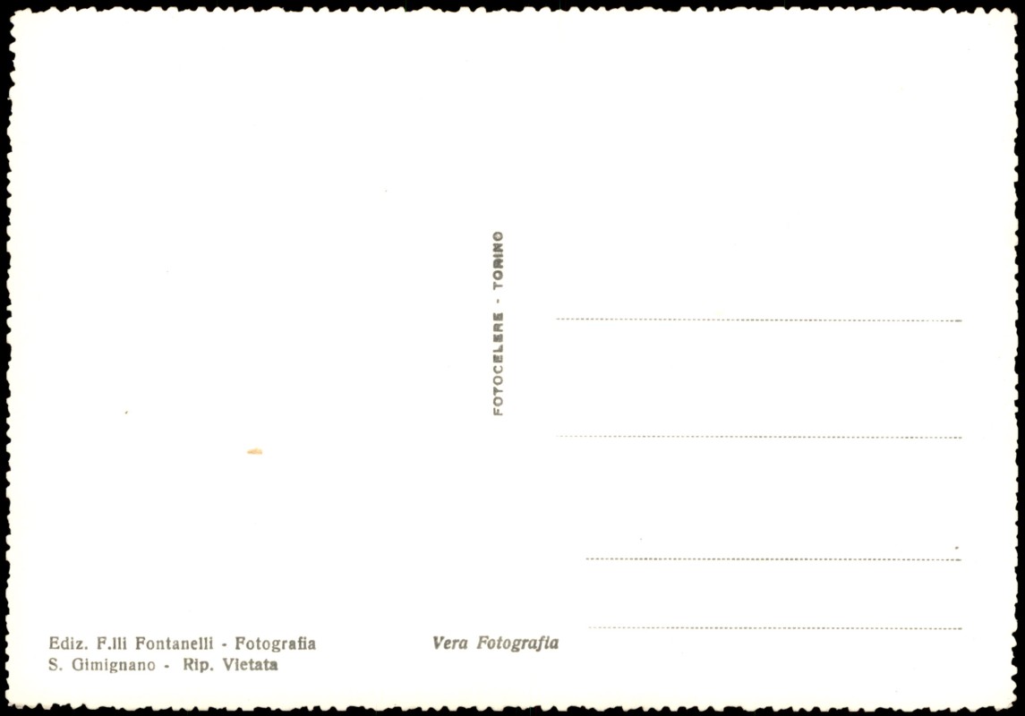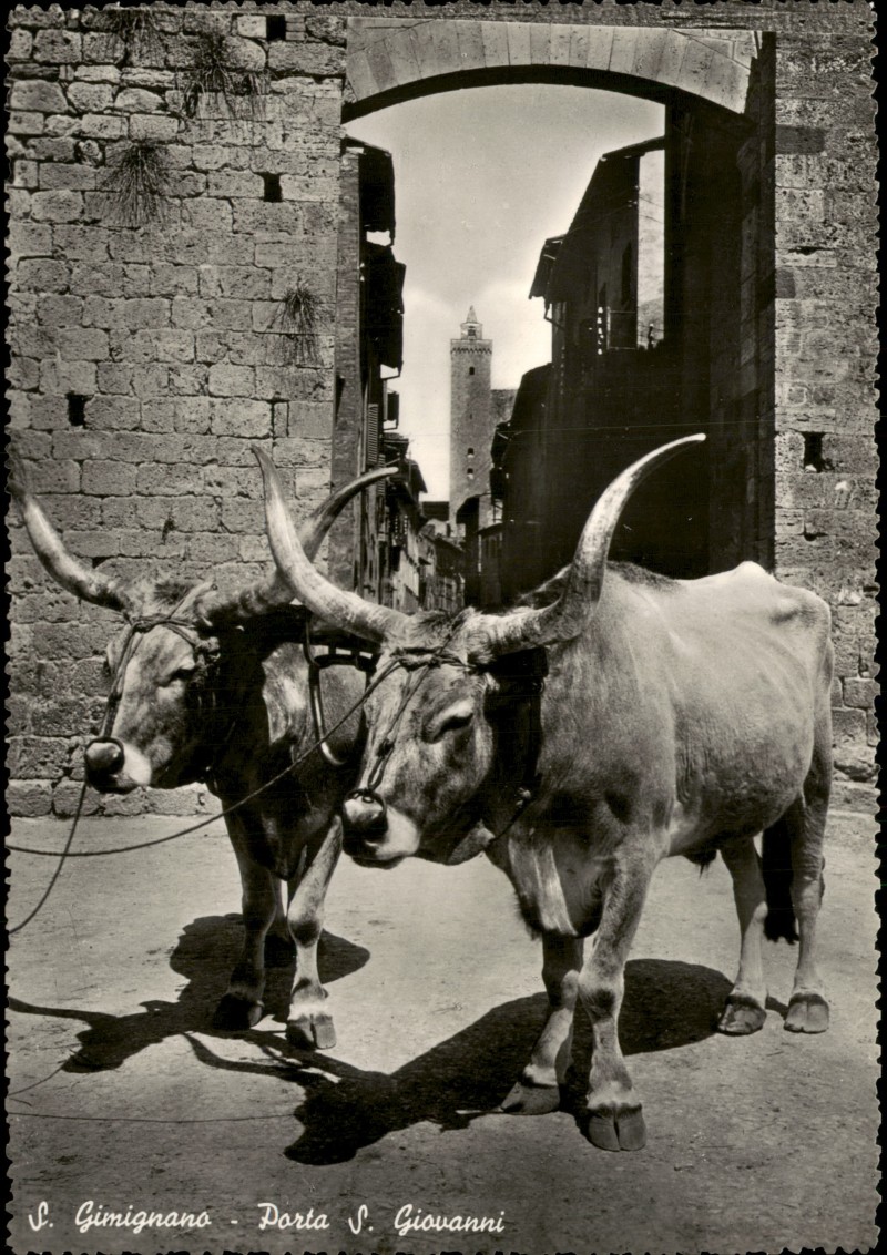 - Echte Fotografie (Vera Fotografia) der Porta San Giovanni in San Gimignano. Im Vordergrund posieren zwei prächtige Ochsen mit langen Hörnern. Durch den Torbogen ist im Hintergrund einer der mittelalterlichen Türme der Stadt sichtbar. Herausgegeben von Ediz. F.lli Fontanelli, San Gimignano; Druck/Fotostudio Fotocelere, Torino.