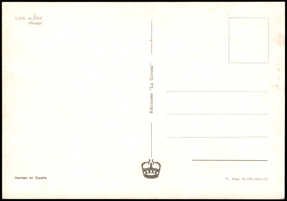 - Farbfotografische Ansicht einer belebten Straße in Álora (Provinz Málaga). Zu sehen sind typische weiße Gebäude, Passanten und zeitgenössische Automobile, darunter ein grüner Seat 600 mit dem Kennzeichen MA 91341. Im Hintergrund ist das Gebäude der 'Bodega El Pintor' sichtbar. Rückseitig bezeichnet mit '5.210 - ALORA (Malaga)'. Gedruckt in Spanien, Depósito Legal von 1975.