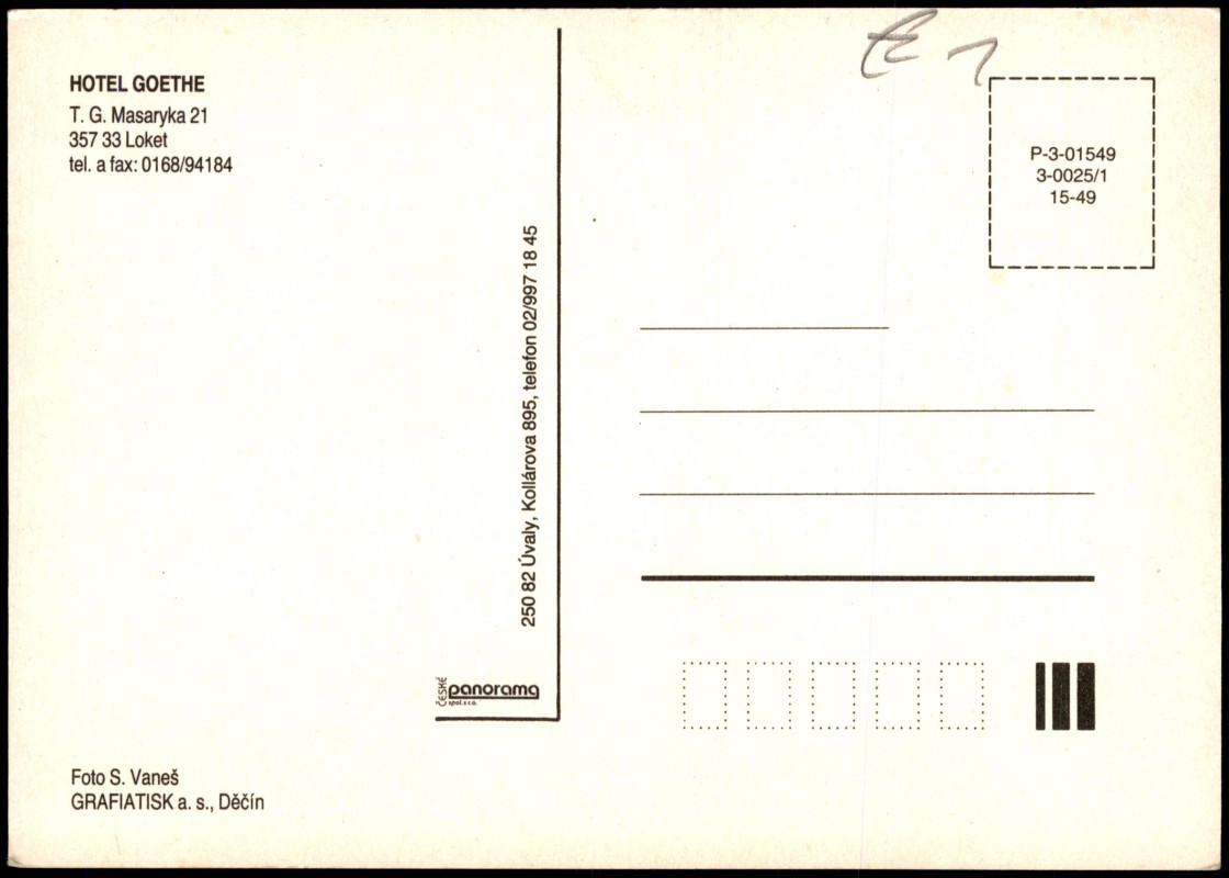 - Mehrbildkarte des Hotels Goethe in Loket (Elbogen), Tschechien. Die Ansichten umfassen die Außenfassade des Hotels, ein Stadtpanorama mit der Burg Loket (Hrad Loket) sowie Innenaufnahmen eines Gästezimmers und des Restaurantbereichs mit markantem Kreuzgewölbe. Fotograf: S. Vaneš. Herausgegeben vom Verlag panorama, Úvaly und gedruckt bei GRAFIATISK a. s., Děčín. Die Karte stammt vermutlich aus den 1990er Jahren.