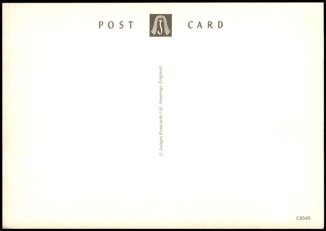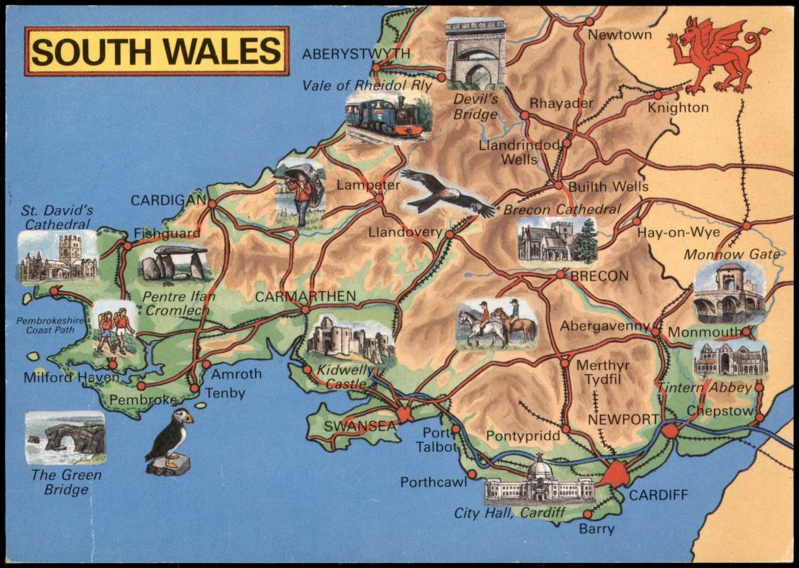 - Farbenfrohe, illustrierte Landkarte (Pictorial Map) von Süd-Wales (South Wales). Die Karte zeigt zahlreiche Orte wie Cardiff, Swansea, Newport, Aberystwyth und Tenby sowie Illustrationen lokaler Sehenswürdigkeiten wie St. David's Cathedral, Kidwelly Castle, Tintern Abbey, Devil's Bridge und die Vale of Rheidol Railway. Zudem sind Symbole wie der walisische Drache und ein Puffin abgebildet. Herausgegeben von Judges Postcards Ltd., Hastings, Seriennummer C8545.