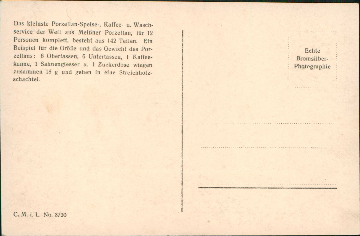- Das kleinste Porzellan-Speise-, Kaffee- u. Waschservice der Welt aus Meißner Porzellan, für 12 Personen komplett, besteht aus 142 Teilen. EinBeispiel für die Größe und das Gewicht des Por-zellans: 6 Obertassen, 6 Untertassen, 1 Kaffee-kanne, 1 Sahnengiesser u. 1 Zuckerdose wiegenzusammen 18 g und gehen in eine Streichholzschachtel.