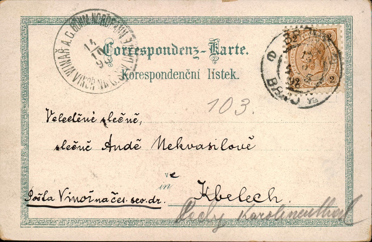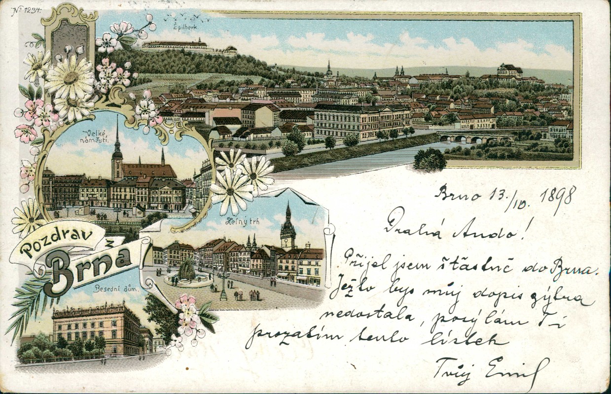historische Ansichtskarte von 1898: Brna Totale Plätze:: Brünn Adressseite