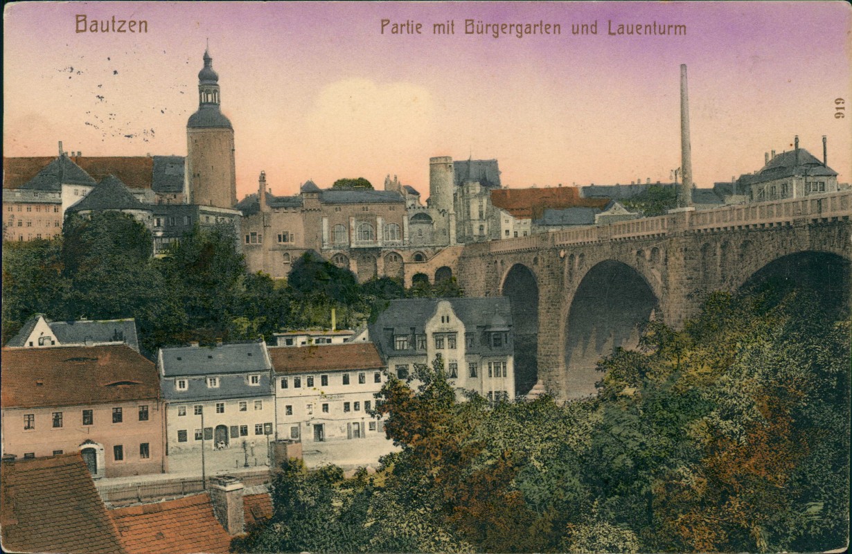 Ansichtskarte: Partie mit Bürgergarten und Lauenturm - Bautzen
