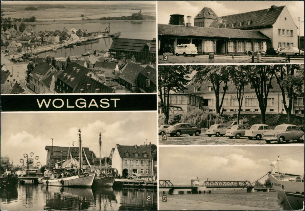 Ansichtskarte: Hafen, Kreiskrankenhaus, HOG Vier Jahreszeiten, Dampferanlegestelle - Wolgast
