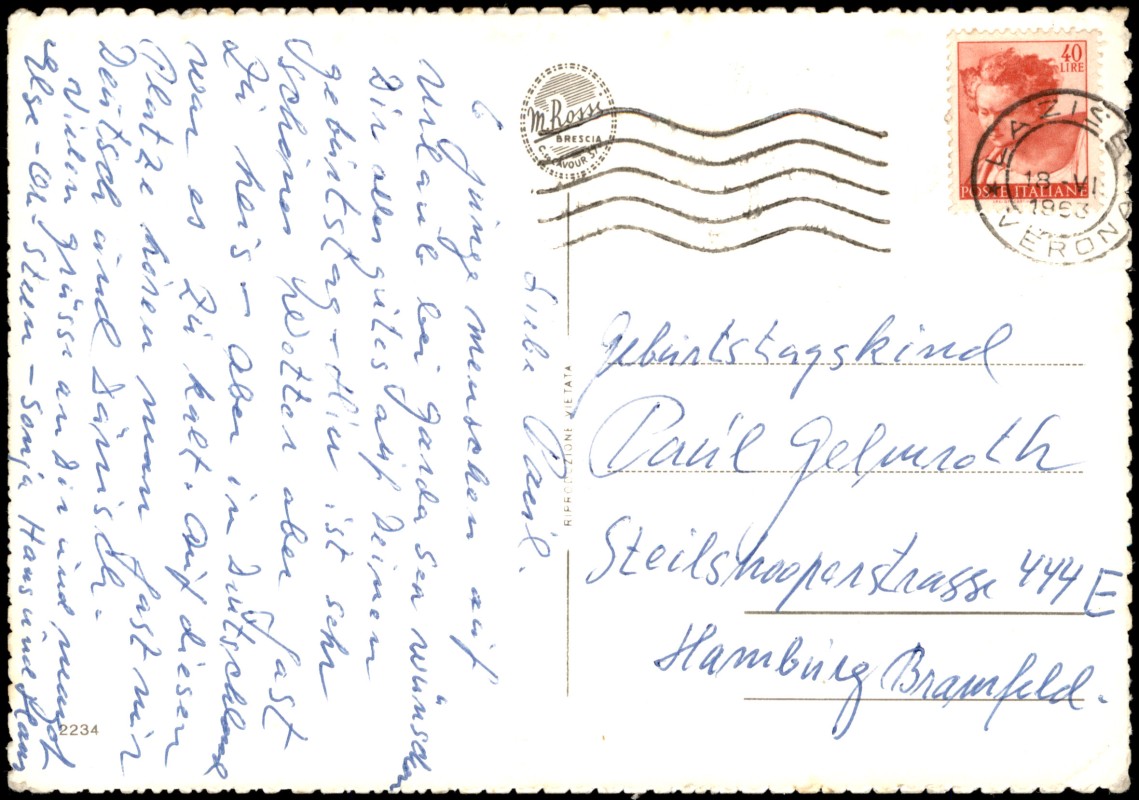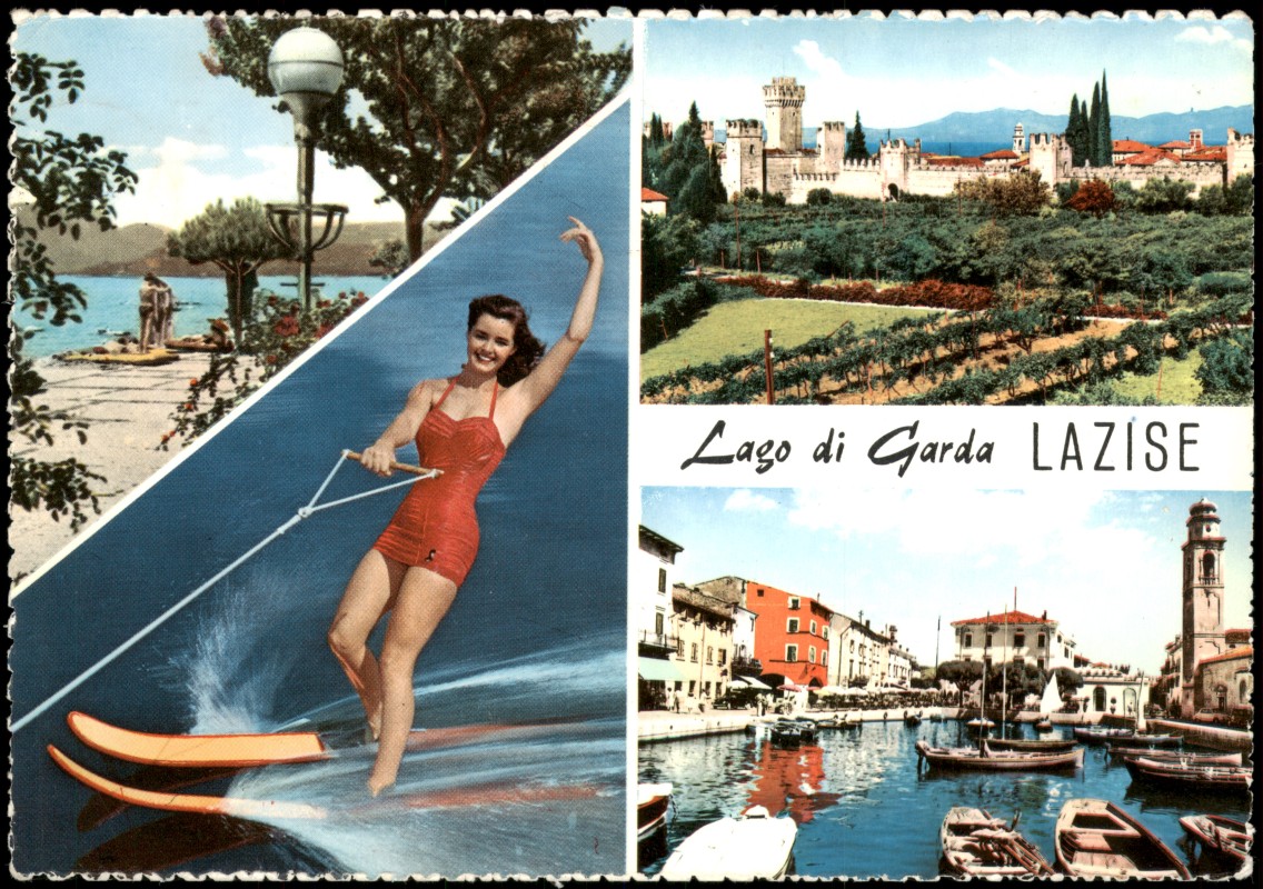 - Mehrbildkarte von Lazise am Gardasee mit drei Motiven: Eine Frau beim Wasserski auf dem See, die mittelalterliche Skaliger-Stadtmauer/Burg sowie eine Ansicht des alten Hafens (Porto Vecchio) mit Fischerbooten und dem Kirchturm von San Nicolò. Gedruckter Text auf der Vorderseite: 'Lago di Garda LAZISE'.