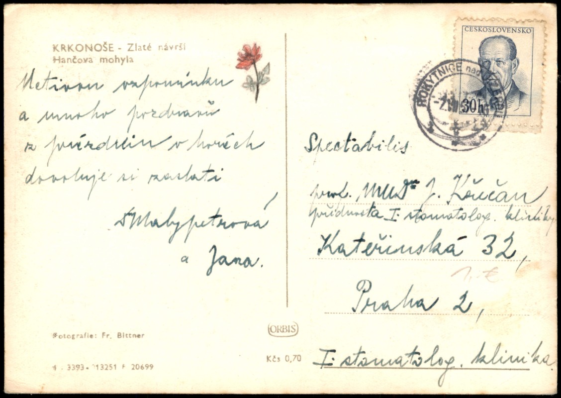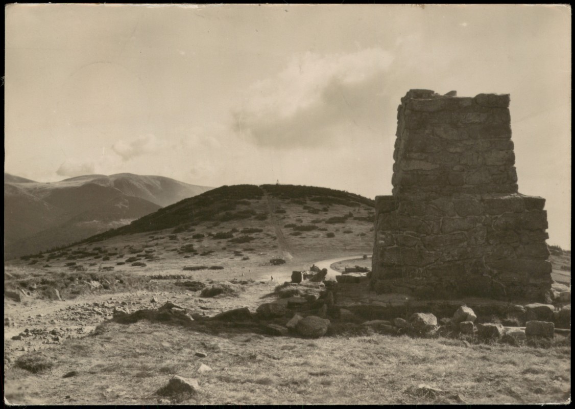 - Schwarz-Weiß-Fotografie des Hanč-Denkmals auf der Goldhöhe im tschechischen Riesengebirge (Krkonoše). Das Denkmal aus Steinblöcken erinnert an den Skirennläufer Bohumil Hanč. Die Aufnahme stammt von Fr. Bittner und wurde im Verlag Orbis veröffentlicht. Die Karte weist einen Preisaufdruck von 0,70 Kčs auf.