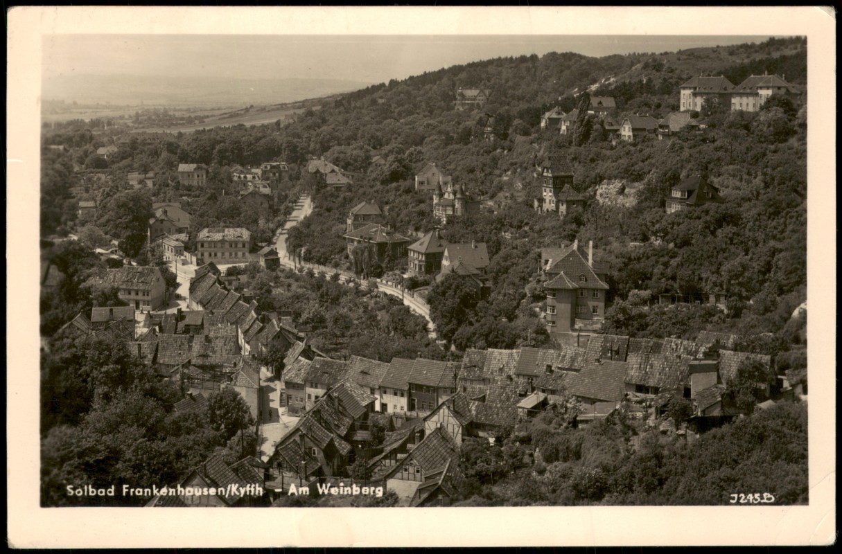 - Panoramaansicht von Solbad Frankenhausen/Kyffh, aufgenommen vom Weinberg. Die Ansicht zeigt eine dichte Bebauung an einem bewaldeten Hang. Herausgegeben vom Verlag Kurt Görtz, Bad Frankenhausen (Kyffh.), mit der Seriennummer J245.B.