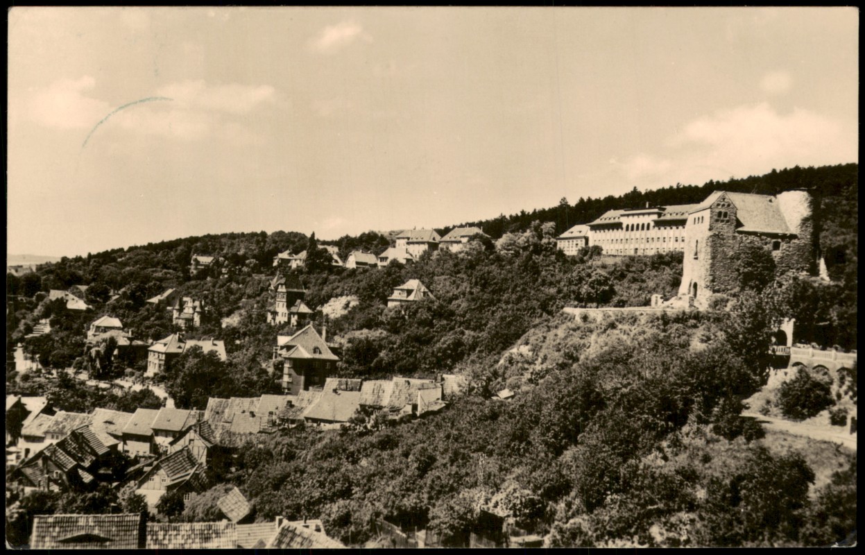 - Historische Teilansicht von Bad Frankenhausen (Kyffh.) mit dem markanten Hausmannsturm und einem Kindersanatorium. Die Karte wurde von VEB Bild und Heimat, Reichenbach i. V. herausgegeben. Der Fotograf ist 'Bild und Heimat (Darr)'. Der Verbraucherpreis betrug 0,20 DM. Die Bestellnummer ist 8/1835 und die Karte trägt die Kennzeichnung V 11 28 A 246/59 DDR.