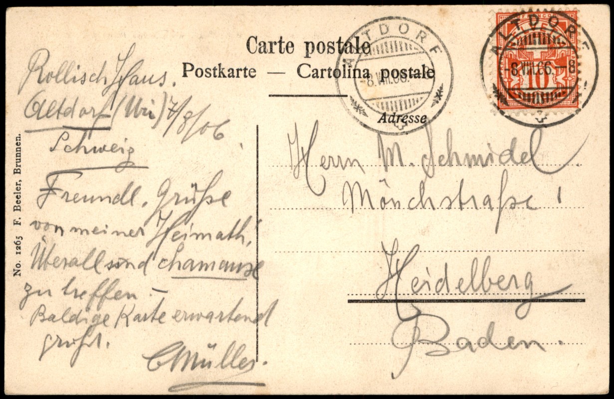 - Historische Ansicht von Seelisberg, die einen Panoramablick von der Terrasse eines Kuretablissements zeigt. Im Vordergrund ist ein dekoratives Geländer zu sehen, an dem sich eine Person lehnt und auf den darunterliegenden See und die umliegende, teilweise schneebedeckte Berglandschaft blickt. Die Karte wurde vom Verlag Fr. Beeler in Brunnen unter der Seriennummer 1265 herausgegeben.